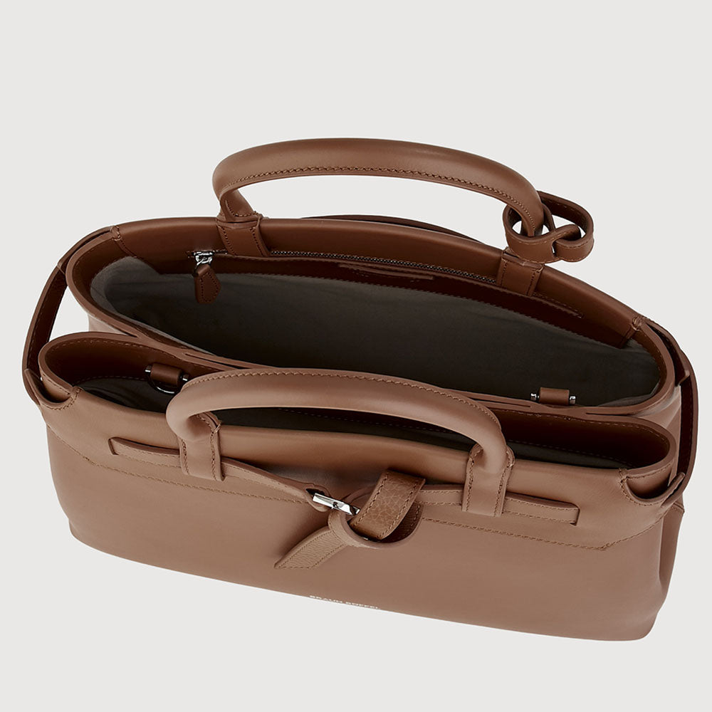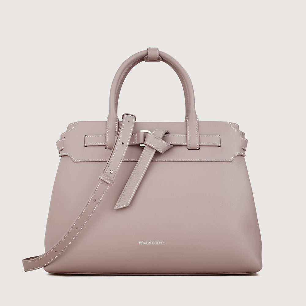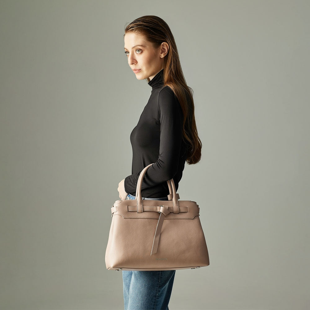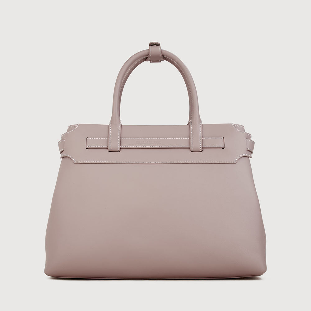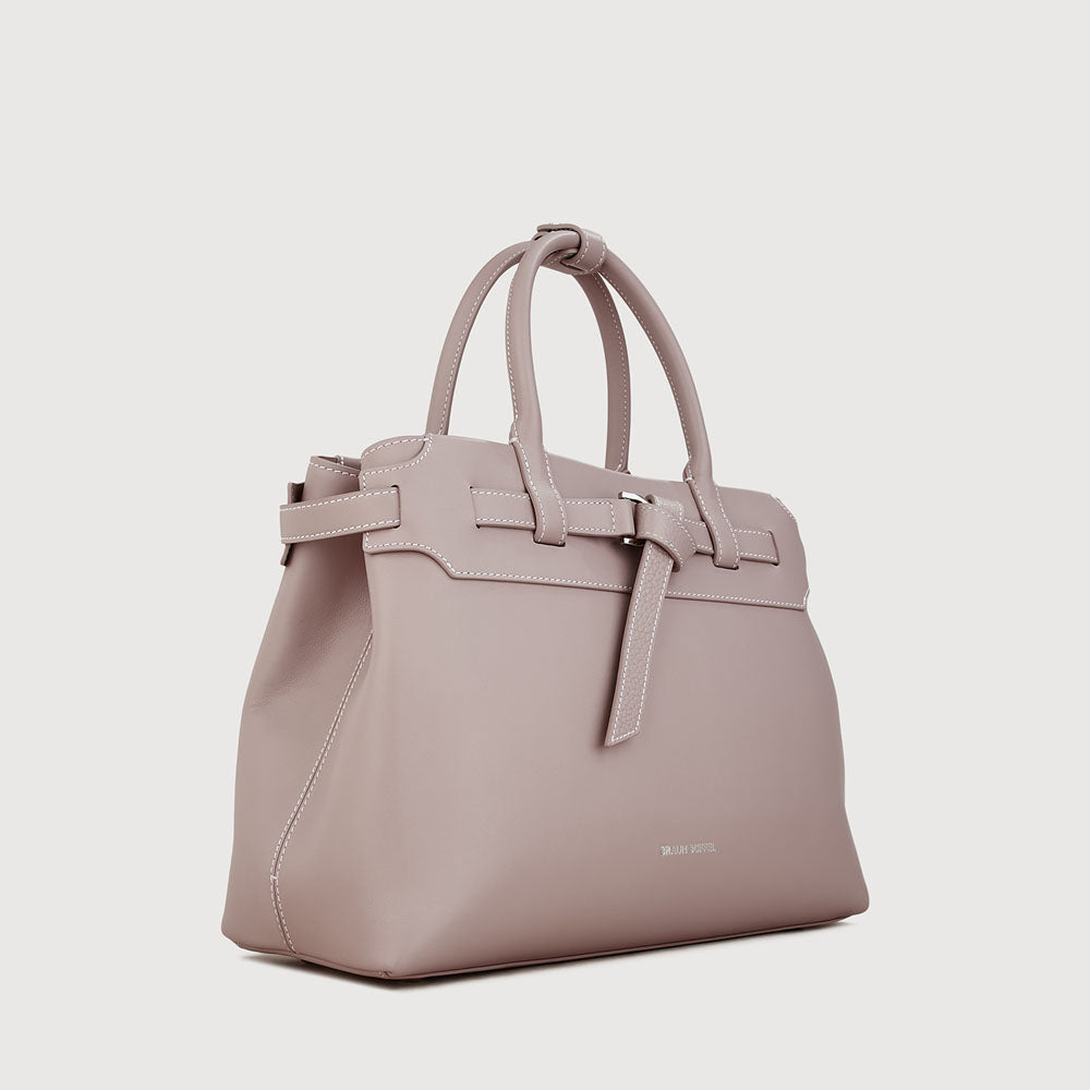 Bindan puts the spotlight on its signature belt knot at the front—a subtle yet striking detail that embodies the idea of connection and elevates the design beyond a simple tote. A removable belt weaves through the top leather panel of the softly structured silhouette, crafted in a mix of pebble and soft gelato leather, combining casual elegance with a minimal, modern finish.